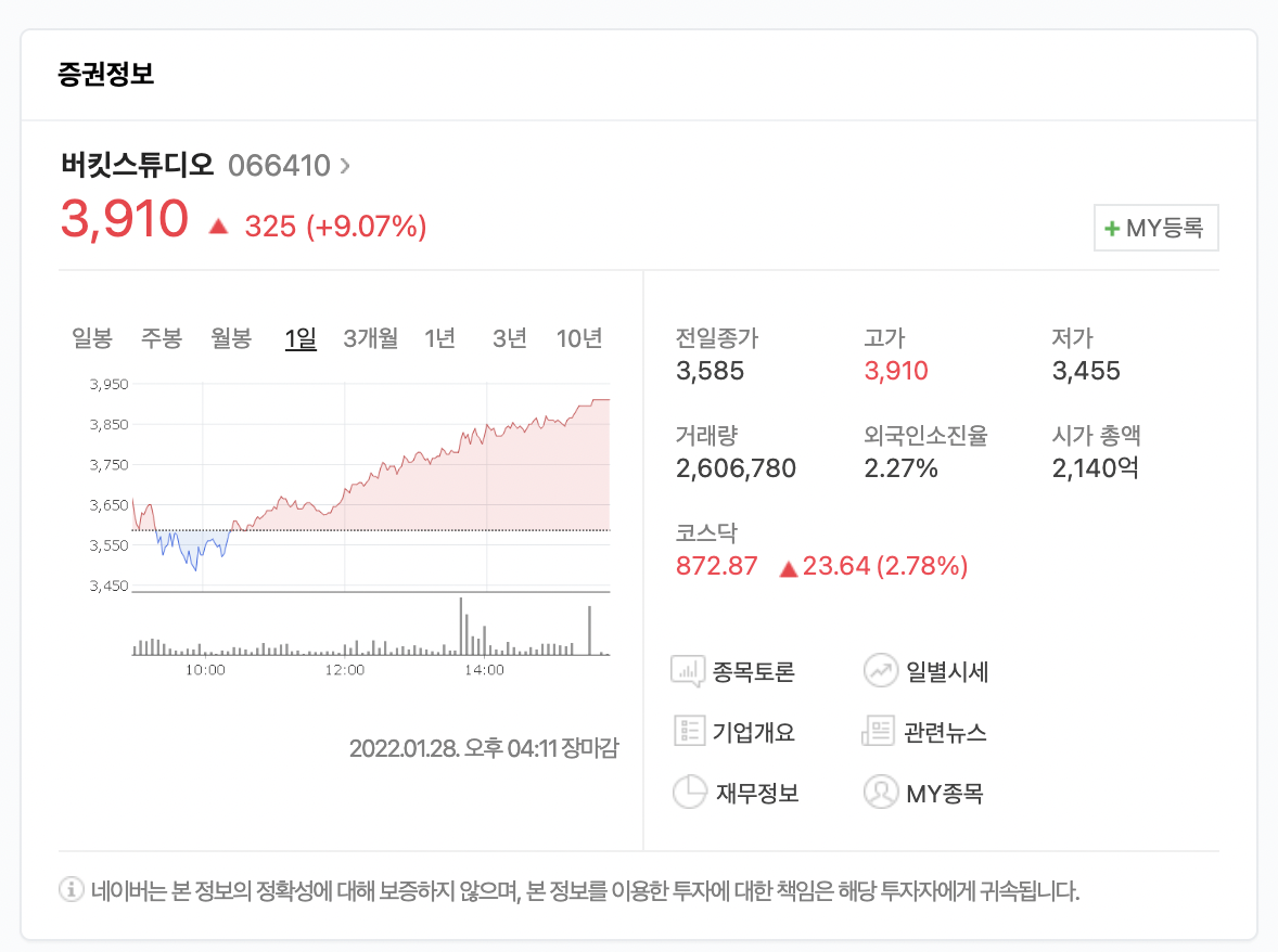 : 위지윅 스튜디오와 마찬가지로 조이현의 소속사 아티스트 스튜디오의 인수를 진행한 기업이라서 지금 우리는 관련주로 분류되고 있습니다. 28일 개봉일에 6.59% 감소한 모습을 보여주었지만, 설 연휴 이후 장이 열리면 상승할 가능성이 높습니다.