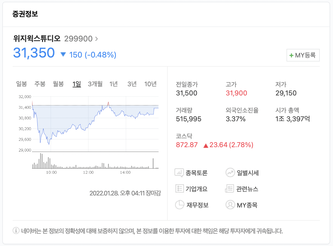 : 위지윅스튜디오는 컴투스와 함께 배우 조이현의 소속사인 아티스트 스튜디오 인수를 진행한 기업입니다. 28일 하락으로 마무리했지만, 지금 우리 학교는 관련주로 분류되어 설 연휴가 끝난 후 상승할 가능성이 높습니다.