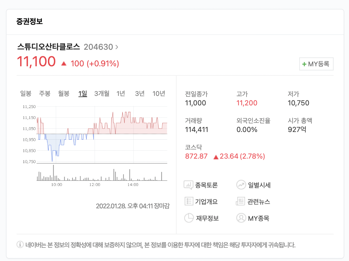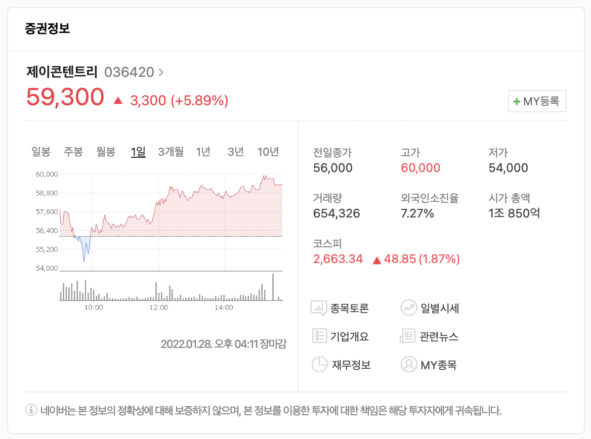 : 위지윅 스튜디오와 마찬가지로 조이현의 소속사 아티스트 스튜디오의 인수를 진행한 기업이라서 지금 우리는 관련주로 분류되고 있습니다. 28일 개봉일에 6.59% 감소한 모습을 보여주었지만, 설 연휴 이후 장이 열리면 상승할 가능성이 높습니다.