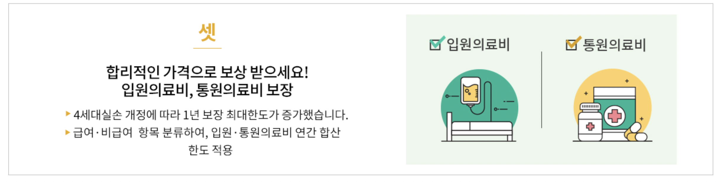 4세대 실비보험은 보험처리를 하게되면 가입자가 부담하는 '최소 공제금액'도 함께 오릅니다. 급여 항목은 병의원급 최소 1만원, 상급종합병원 최소 2만원, 비급여 항목은 최소 3만원으로 인상되었습니다. 단, 보험료는 1만원대지만, 보장 범위가 적은 것이 특징입니다.