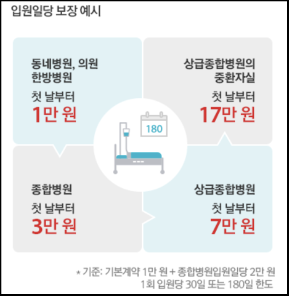 - 종합병원 입원시 매일 3만원, 상급종합병원 입원시 매일 7만원 보장