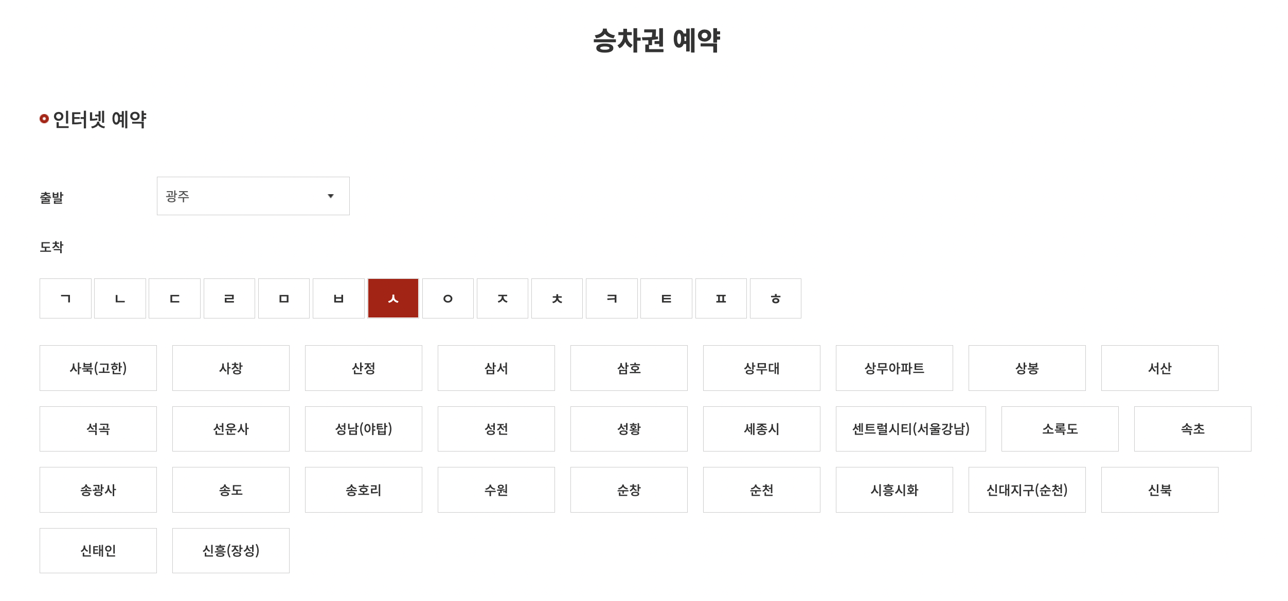 승차권 예약으로 바로 화면이 나타납니다. 출발지는 자동으로 광주로 선택되어 있으며 행선지에 맞게 변경한 후 고속버스통합예매를 클릭합니다.