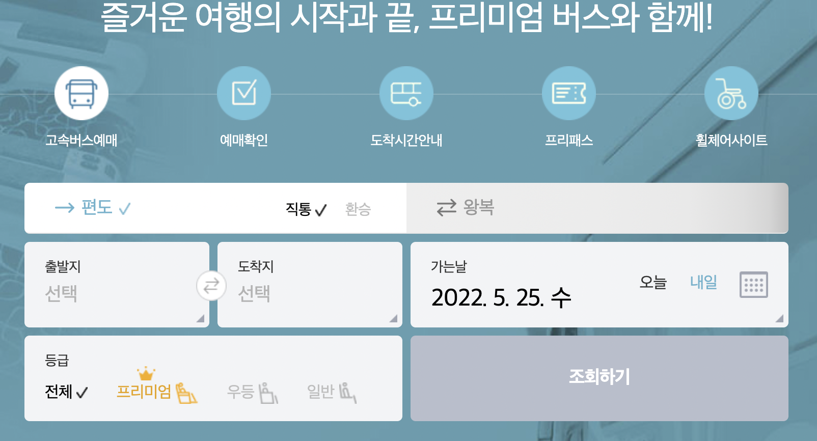 출발지, 도착지, 가는날을 잘 선택한 후 조회하기 버튼을 클릭합니다.
