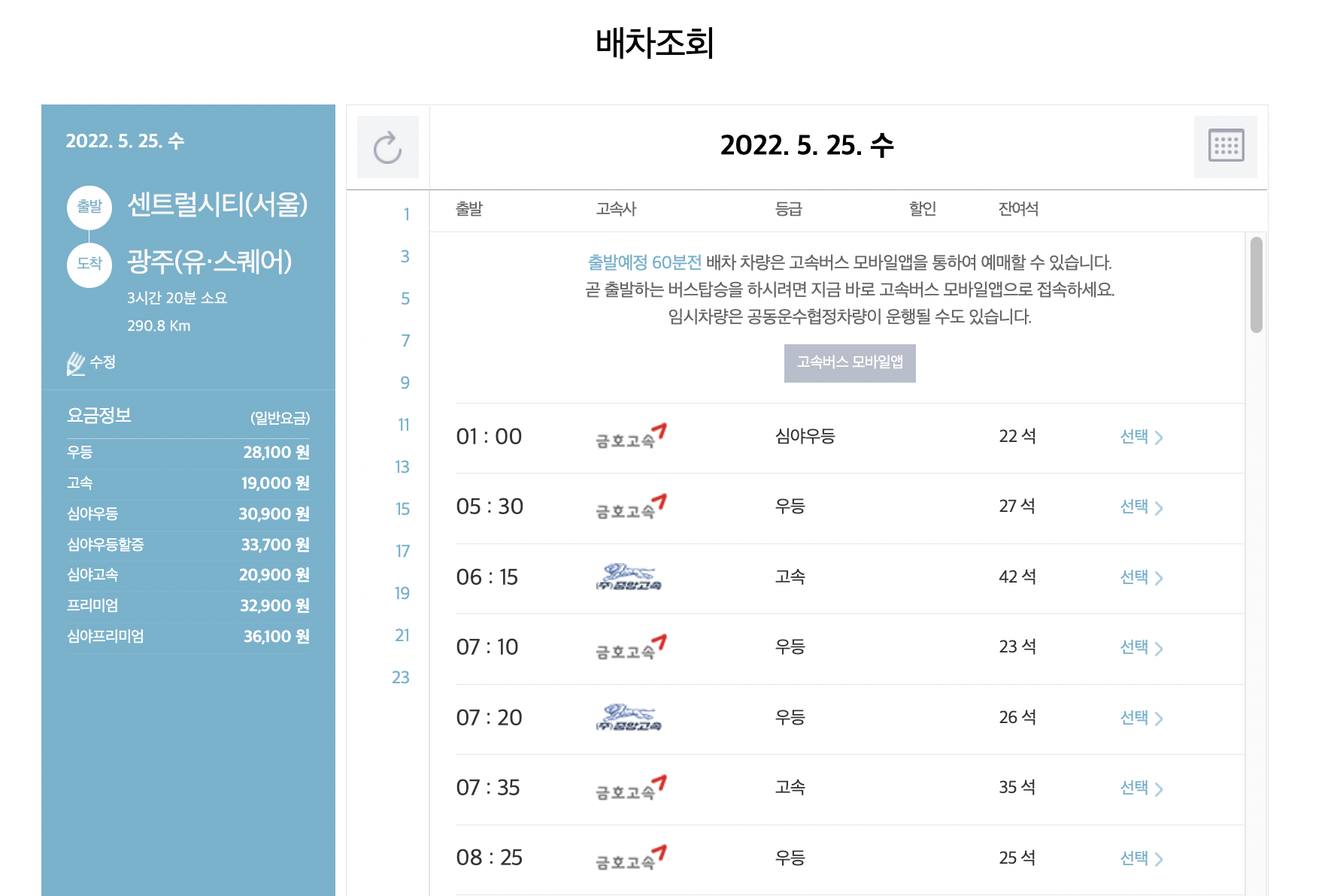 서울-광주(유스퀘어) 요금 정보