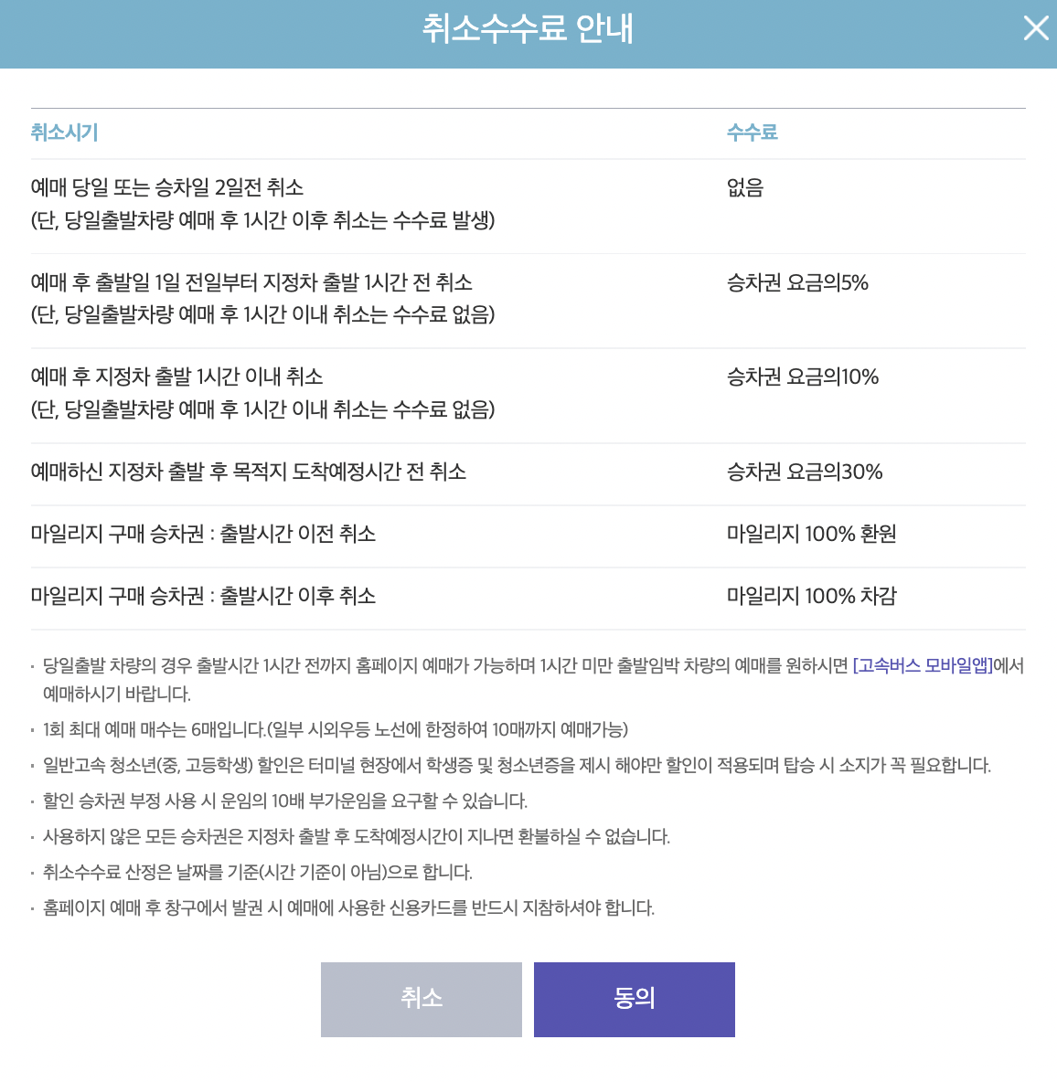 예매 당일 및 승차일 2일전 취소는 따로 수수료 없이 모두 환불됩니다.