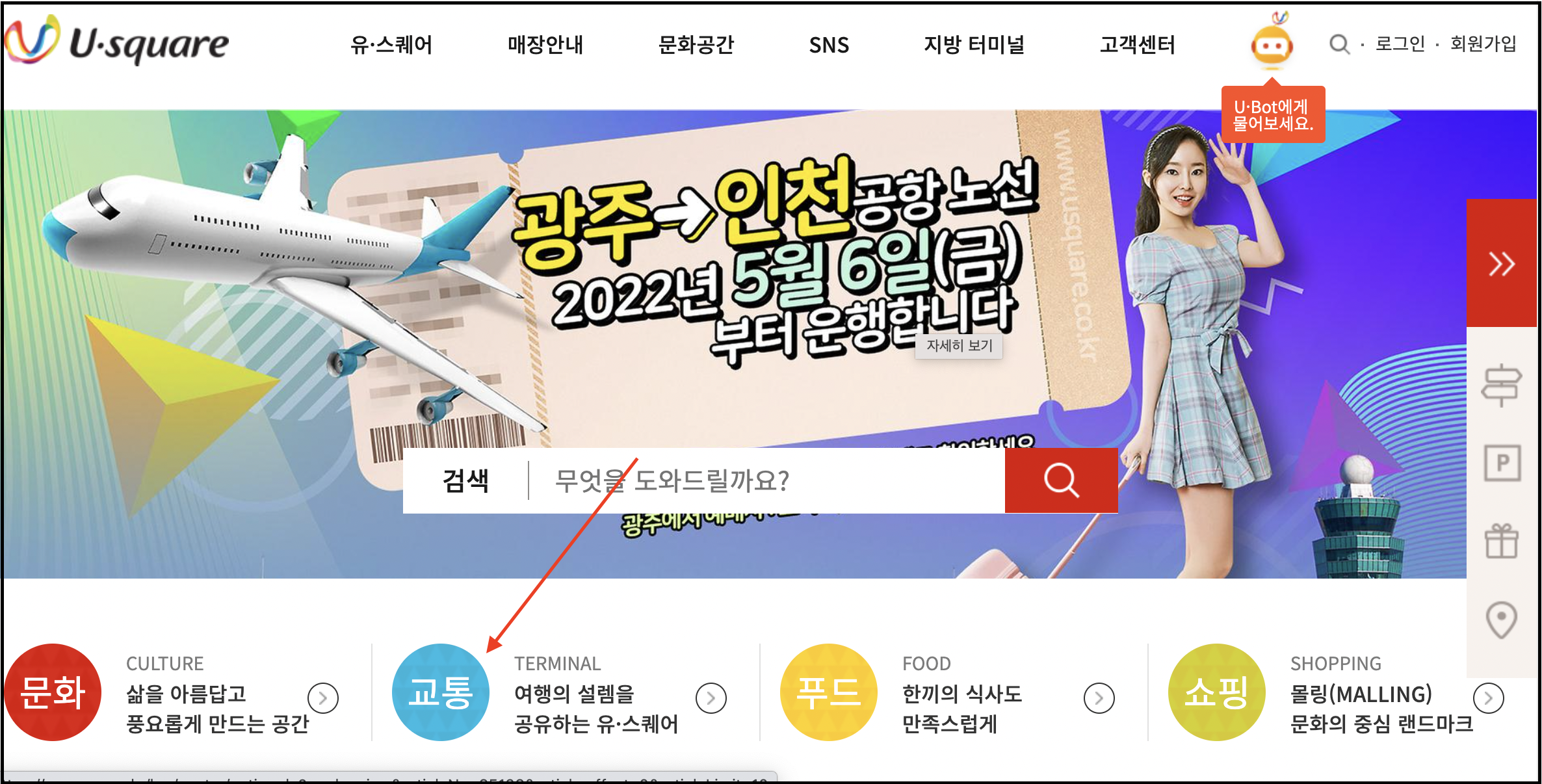 홈페이지 하단에 나와있는 '교통' 아이콘을 클릭합니다.