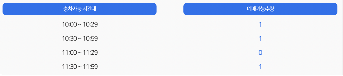 시간 선택을 클릭하면 승차가능 시간대, 예매가능수량 확인이 가능합니다.