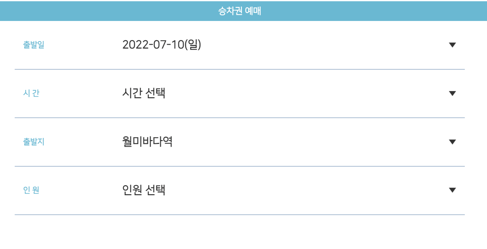 3. 출발일, 시간, 출발지, 인원을 선택합니다.