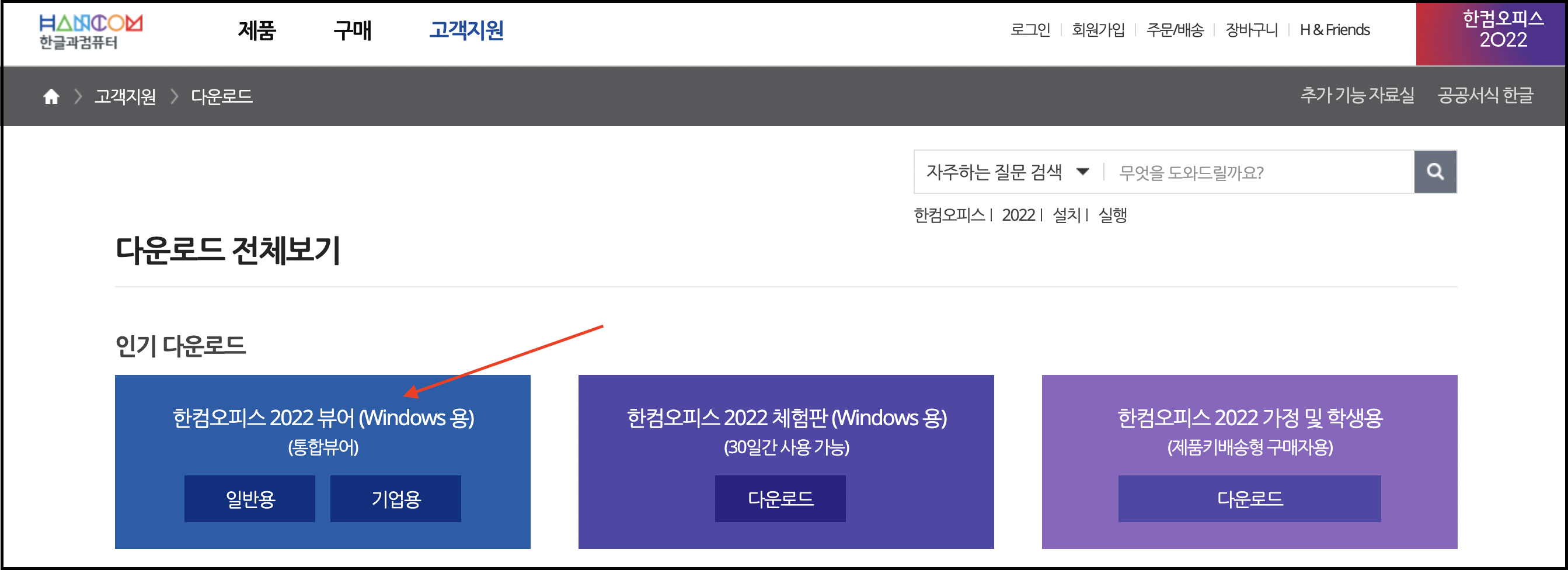 2. 인기다운로드 - 한컴오피스 2020뷰어(Windows용) 일반용을 다운로드 받습니다.