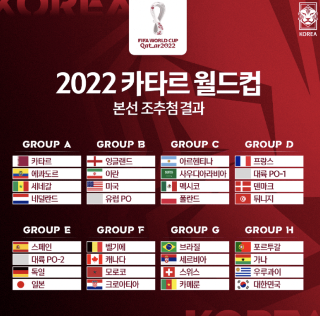 카타르월드컵 총 8개 조로 편성되며 대한민국은 H조입니다.