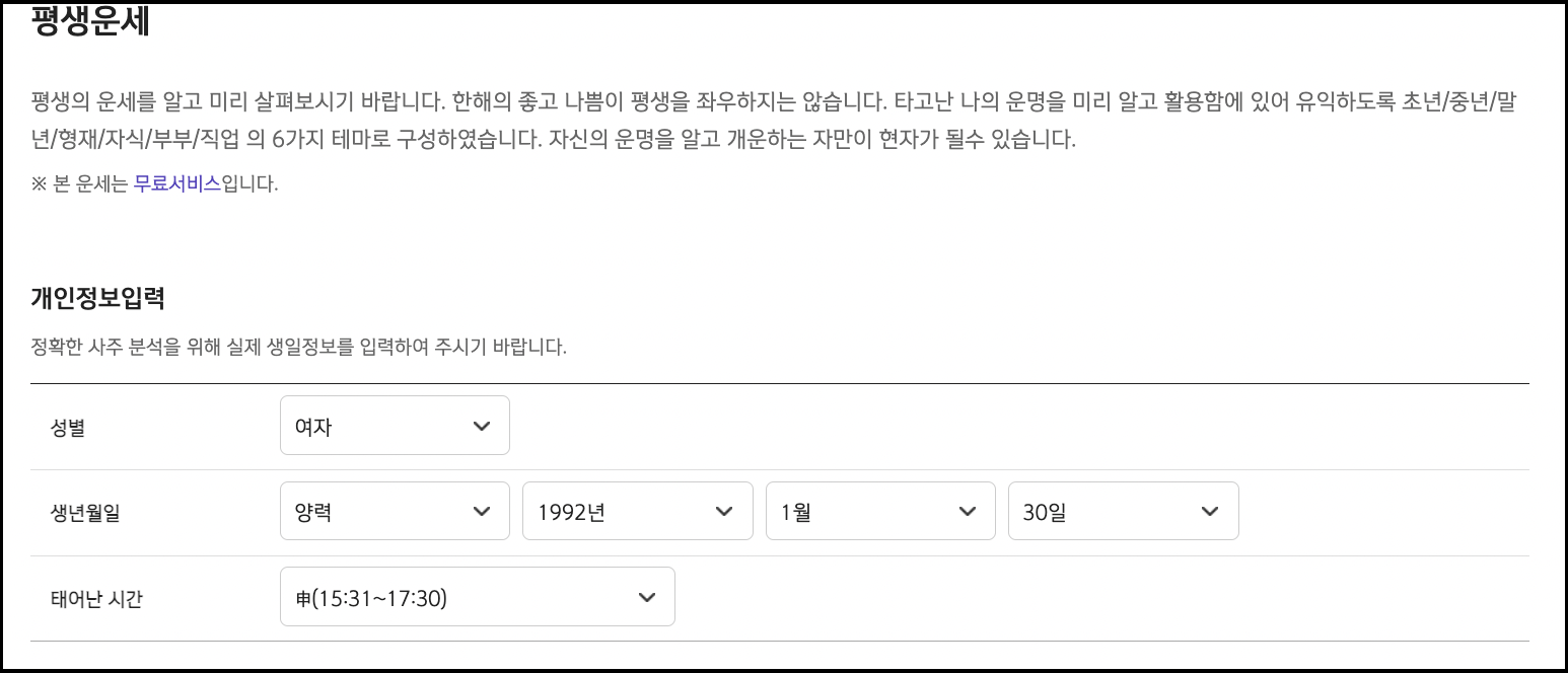 3. 운세를 볼 성별, 생년월일, 태어난 시간을 입력합니다.