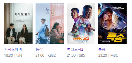 1월 23일은 설날 다음날로 설날특선영화는 카시오페아, 동감, 범죄도시2, 특송입니다. 범죄도시2와 특송은 저도 영화관에서 본 영화인데 모두 연기력, 기획력이 좋았습니다. 안보신 분들은 두개 영화는 꼭 보는 것을 추천합니다.