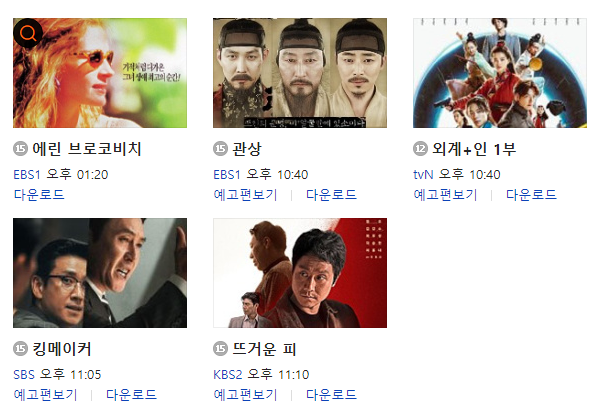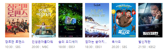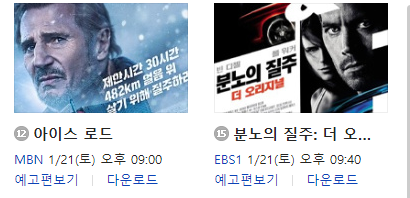 MBN 아이스로드, EBS1 분노의질주 더오리지널, SBS 범죄도시가 방영합니다. 이중 가장 인기가 있는 영화는 범죄도시로 여러번 봐도 마동석, 윤계상의 연기력에 감탄하게됩니다. 재난 영화를 좋아하는 분들이라면 영화 아이스로드도 추천합니다. 더 다양한 영화는 아래를 참고하시길 바랍니다.