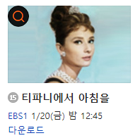 EBS1에서는 고전영화인 '티파니에서 아침을'도 방영합니다. 1962년 개봉한 오래된 영화지만, 오드리 헵번의 연기력과 외모가 돋보이는 영화입니다.