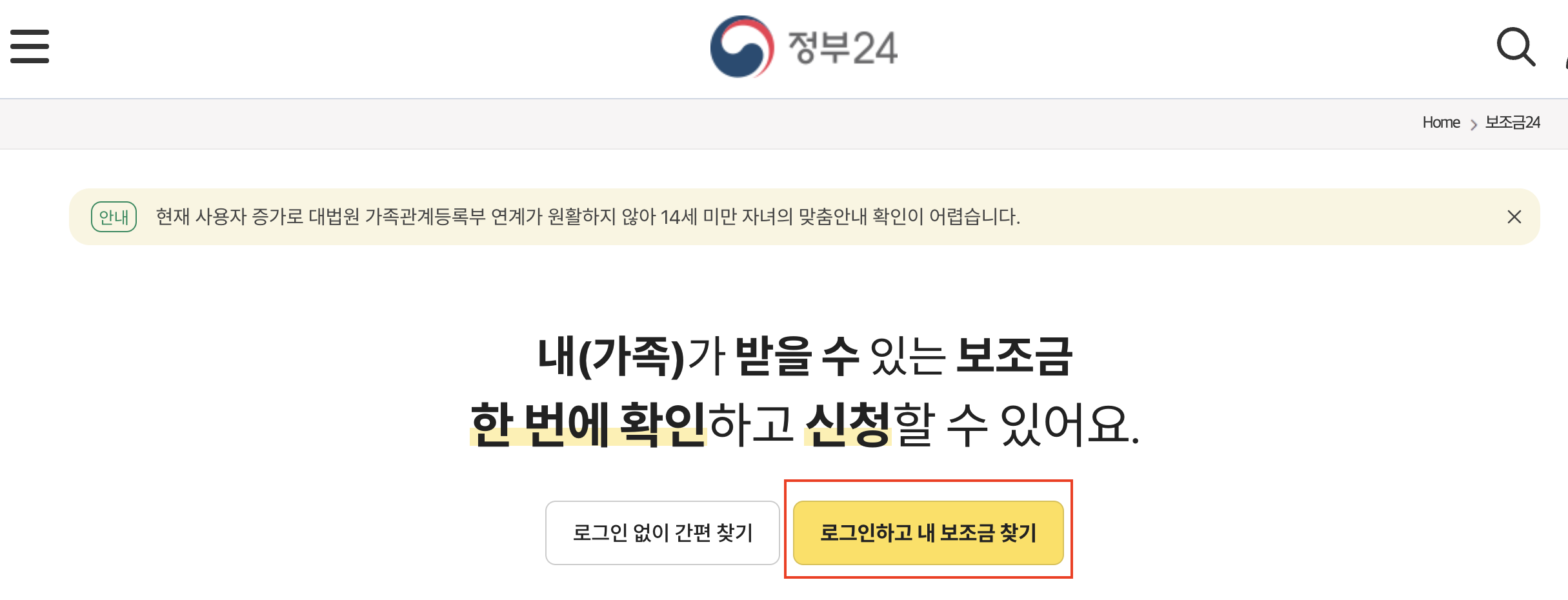 1. 먼저 보조금24 홈페이지에 접속합니다.