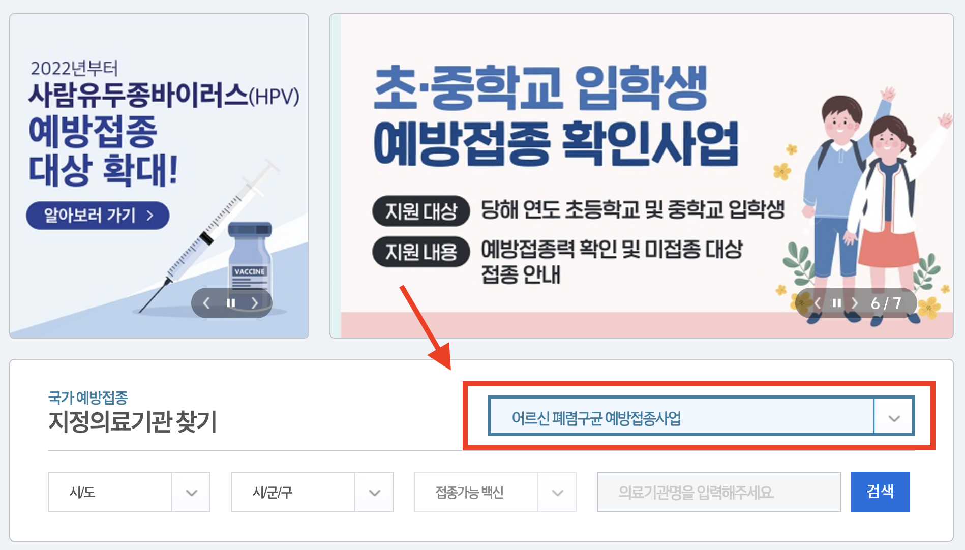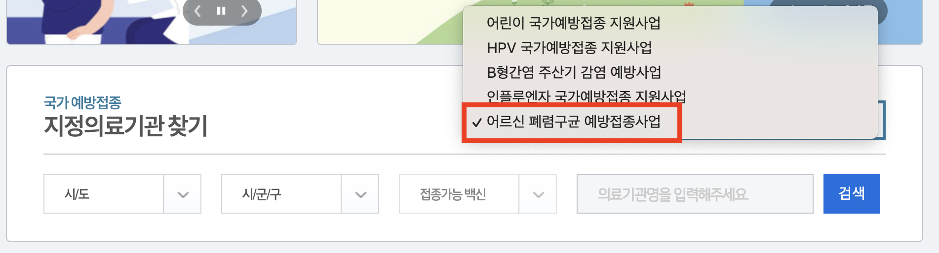 2. 화살표 표시된 부분을 클릭한 후 '어르신 폐렴구균 예방접종사업'을 선택합니다.