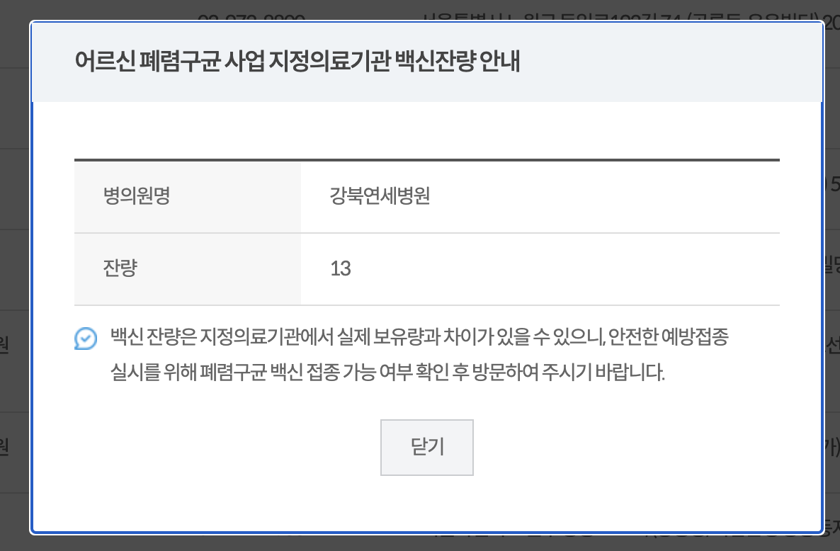 백신잔량이 있는 의료기관이어도 방문전 전화를 한번 해보신 후 더블 체크해보시길 바랍니다. 백신 잔량이 실시간으로 업데이트 되는 것이 아니므로 폐렴구균 백신 잔량이 없을 수도 있습니다.