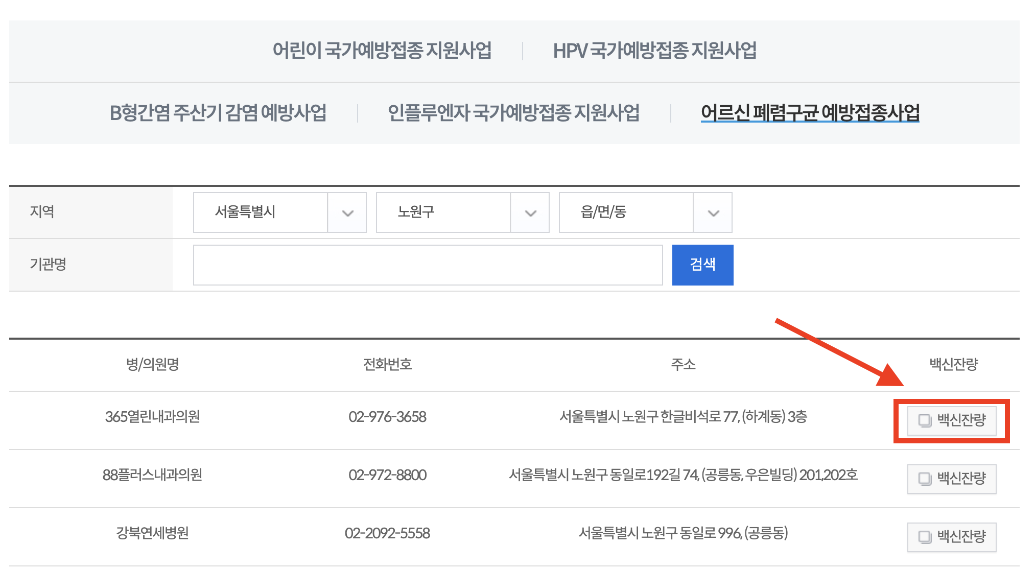 4. 거주지에서 가까운 의료기관의 '백신잔량'을 선택하여 확인합니다.