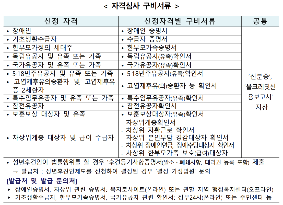 1) 우선계약대상자 : 복권 및 복권기금법 제30조, 시행령 제21조에 따른 우선계약대상자로서 국가기관에 등록, 결정되어 관련 증빙서류를 발급받을 수 있는자
