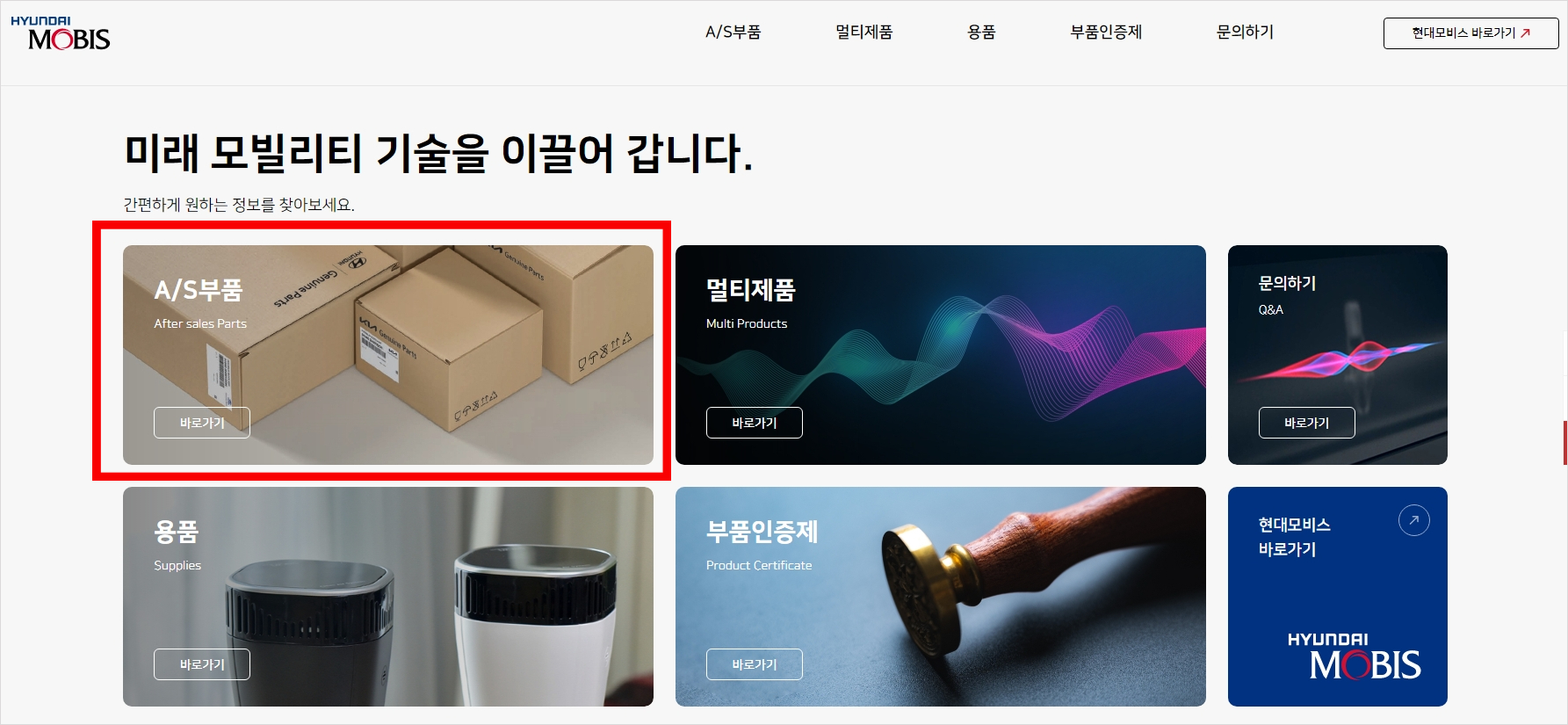 1. 현대자동차 부품조회 홈페이지 접속 후 'A/S 부품' 바로가기를 선택합니다.