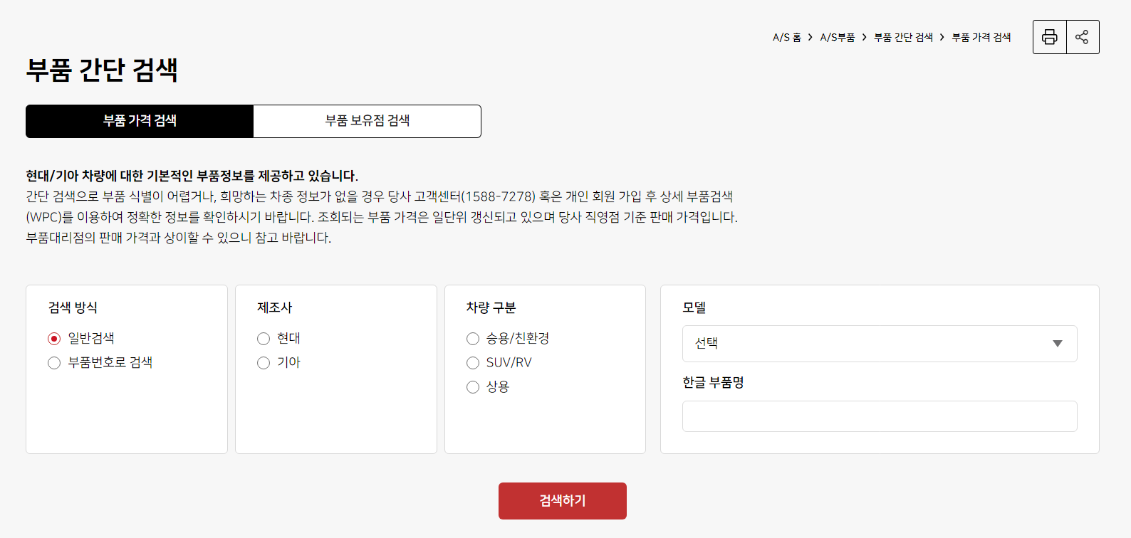 3. 제조사, 차량 구분, 모델, 한글 부품명을 입력한 후 검색하기를 클릭합니다.