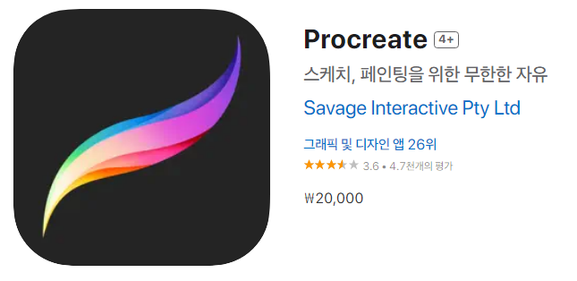 성능은 어도비 포토샵과 비교해도 전혀 뒤쳐지지 않을 정도로 스펙이 매우 좋은 그리기 어플 중 하나입니다. 평점도 4.4점 정도로 높은 편이며 그래픽 및 디자인 앱에서 8위를 기록했습니다.