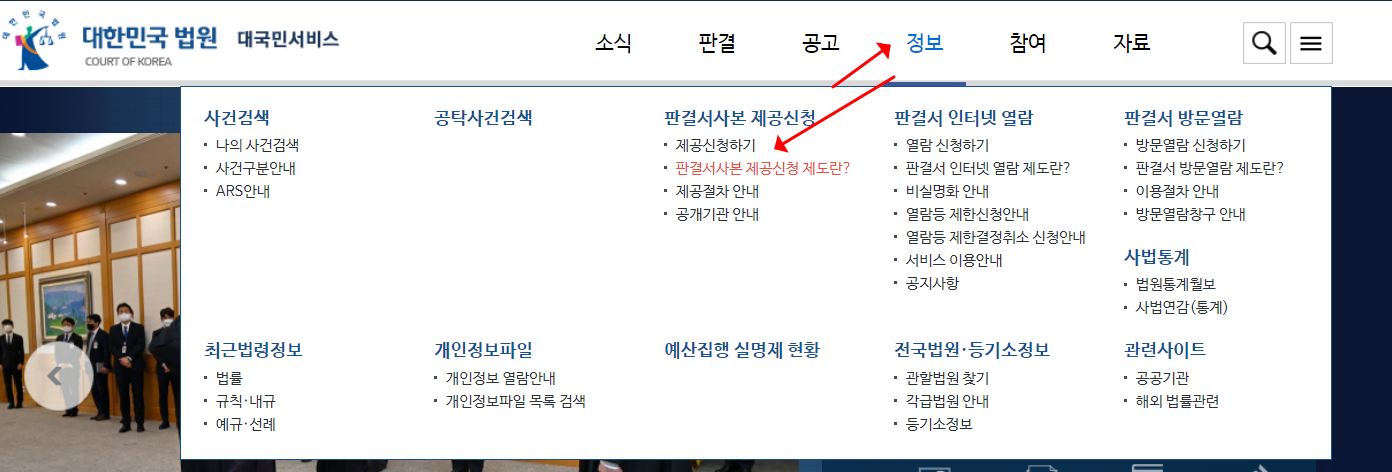 2. 대법원 홈페이지 첫 화면에서 '정보' 탭을 누르고, '판결서사본 제공신청하기'를 선택합니다.