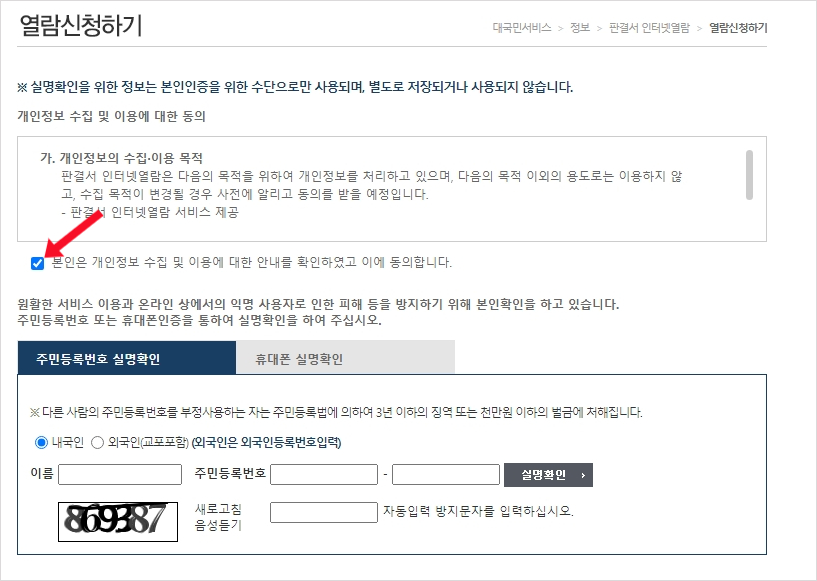 4. 개인정보 수집 동의를 선택하고, 주민등록번호 실명확인을 진행합니다.