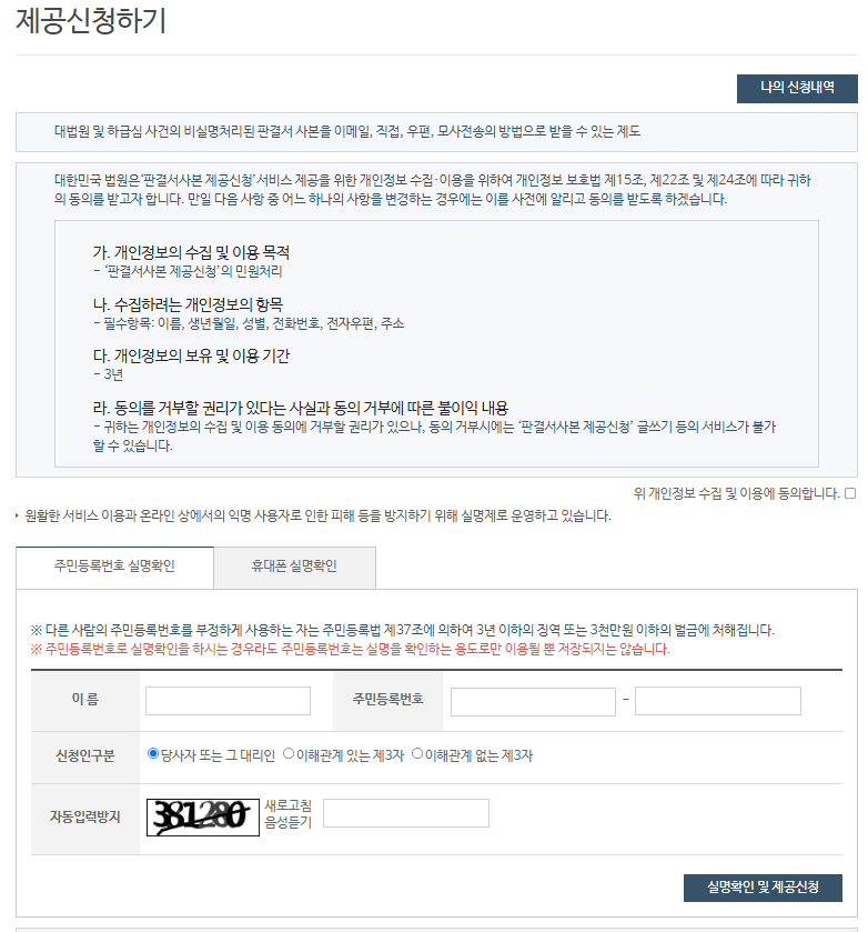 4. 판결문 제공 신청시 신청인 거주 주소, 이메일, 휴대폰 번호 등 정보를 입력합니다.