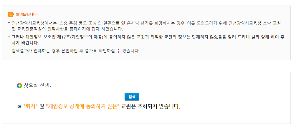 인천광역시 교육청은 옛 은사 찾기가 가능하며 퇴직, 개인정보 공개에 동의하지 않은 교원은 조회되지 않습니다.