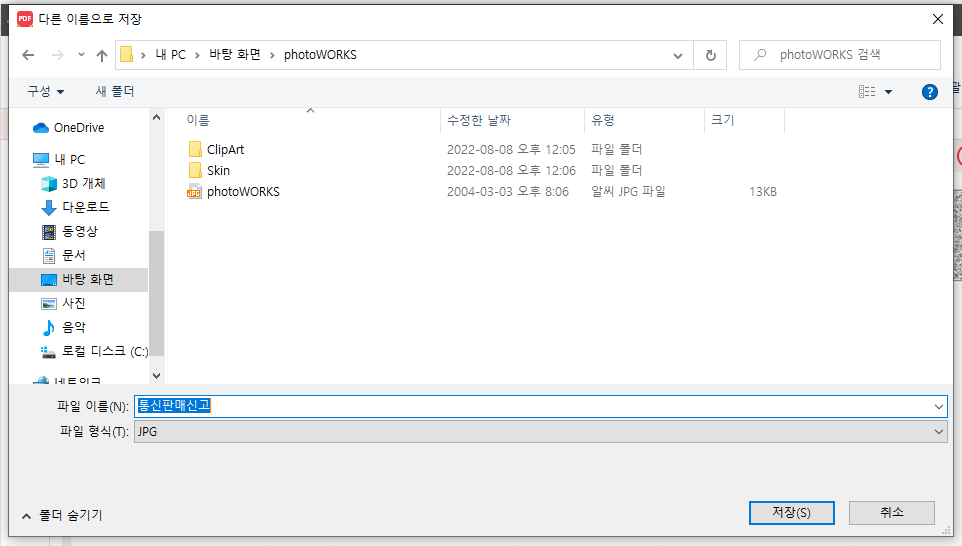 3. 다른이름으로 저장 팝업이 뜨면 원하는 폴도의 위치, 파일 이름을 선택한 후 '저장'을 클릭합니다.