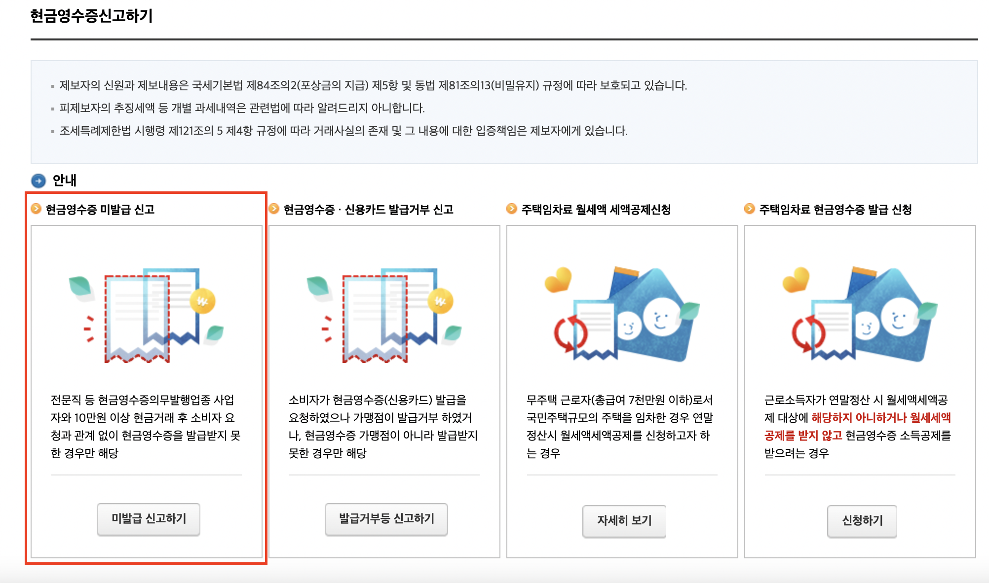 판매자 입장에서는 현금영수증 발급은 세금 신고라서 되도록 현금영수증 발급하지 않는 것을 선호합니다. 그래서 다른 혜택을 주겠다며 현금영수증을 거부하기도 합니다. 만약 현금영수증 의무 발행 업종에 속하는데 거부를 당하셨다면 국세청 홈택스에서 신고를 할 수 있습니다.
