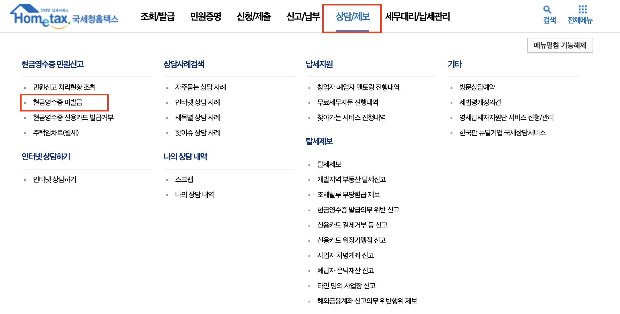 국세청 홈택스 홈페이지에 접속한 뒤 상담/제보 탭에서 현금영수증 미발급을 선택합니다. 현금영수증 미발급 신고하기를 클릭한 후 공급자(미발급자), 신고 내용을 정확하게 작성하면 됩니다. 첨부 파일에는 통화 내용, 문자 등을 첨부하여 증거를 제시해야 합니다.
