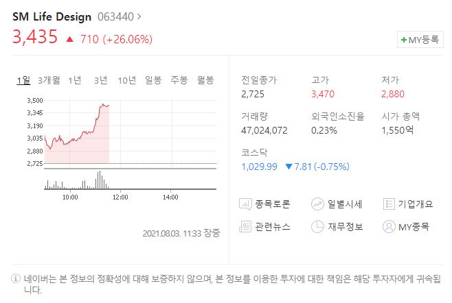 SM 지분 인수와 관련된 기사가 나오며 이와 관련된 주식인 SM C&C(048550), SM Life Design(063440)의 주가가 크게 상승했습니다. 특히 SM C&C는 상한가를 기록하며 4,945원 고가를 기록했습니다. 현재 거래량은 64,821,174이며 시가 총액은 4,695억입니다.