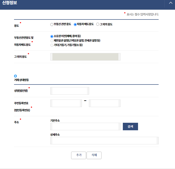 4. 용도, 거래 상대방 정보 등을 입력합니다.