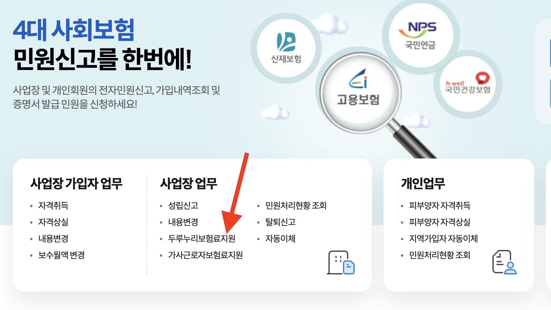 - 기가입 사업장 : 4대사회보험 정보연계센터 홈페이지 > 사업장 업무 > 두루누리보험료지원