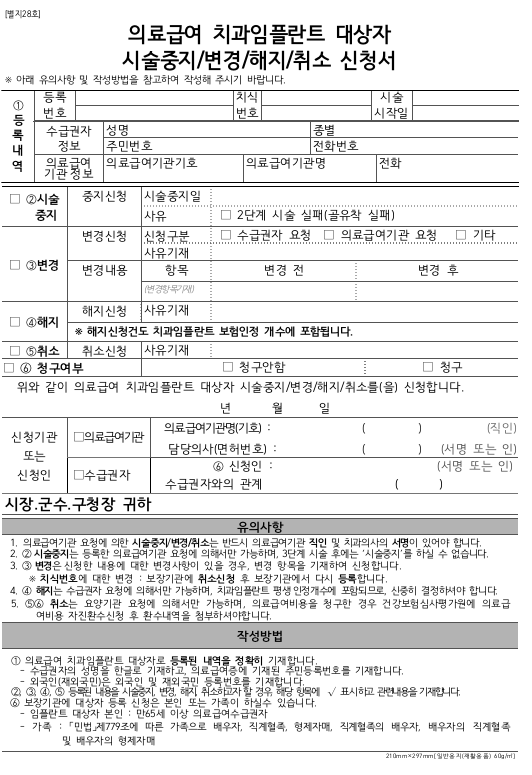 의료급여 치과임플란트 대상자 등록 신청서는 신규, 재등록 양식이 있고, 시술중비변경해지취소 신청서가 있습니다.