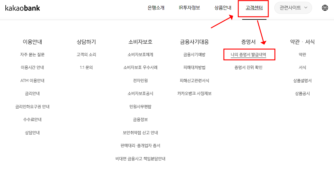 3. 고객지원-증명서 발급 카테고리를 선택합니다.