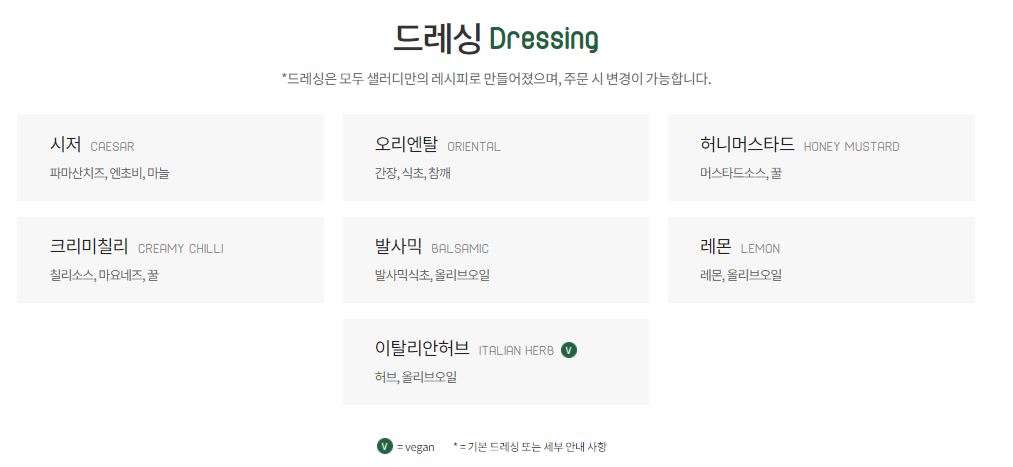 드레싱은 모두 샐러디만의 레시피로 만들어졌으며, 주문 시 변경이 가능합니다. 종류로는 시저, 오리엔탈, 허니머스터드, 크리미 칠리, 발사믹, 레몬, 이탈리안 허브가 있습니다.