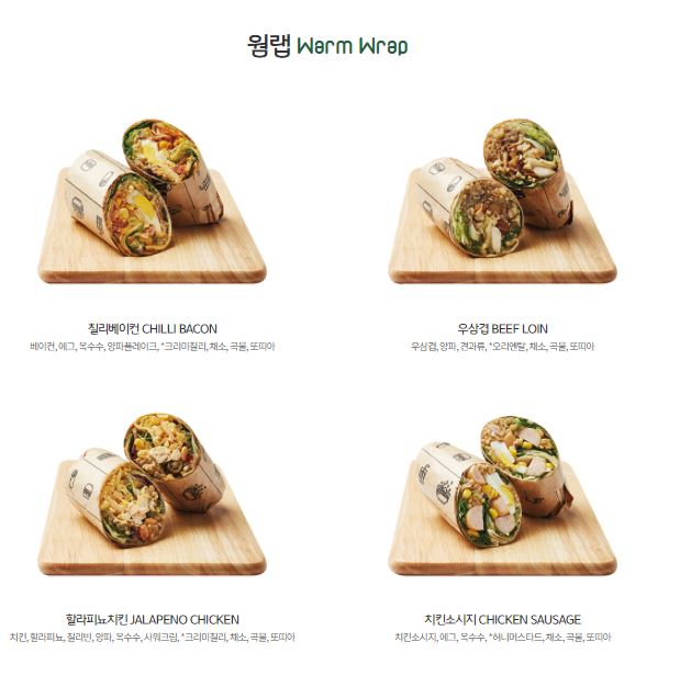 웜 랩에는 웜볼과 마찬가지로 곡물 50%가 함유되어있어서 랩보다는 포만감이 높은 메뉴입니다. 대표 메뉴는 칠리 베이컨입니다. 베이컨, 에그, 양파 플레이크, 옥수수가 함유되어있습니다. 추천 소스는 크리미 칠리입니다.