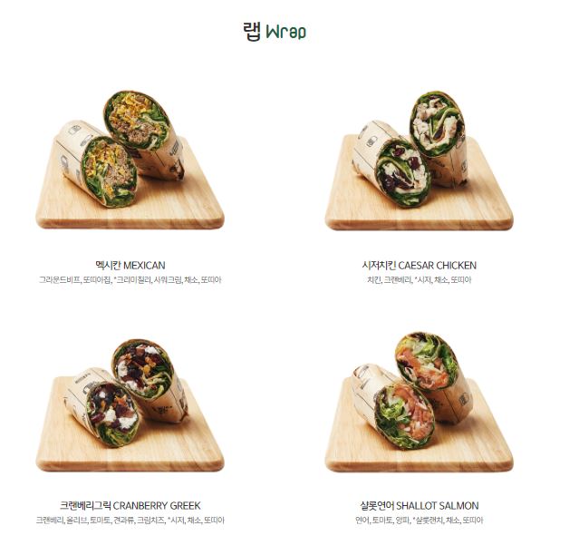 샐러드, 랩, 웜 랩 3가지 중 각각 메뉴 추천을 해드리겠습니다. 칼로리는 모두 배제했으며 오직 맛으로만 추천하는 점을 참고하시길 바랍니다.