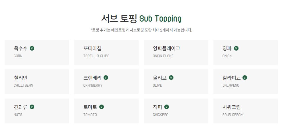 서브 토핑으로는 옥수수, 토르티야 칩, 양파 플레이크, 양파, 칠리 빈, 크랜베리, 올리브, 할라피뇨, 견과류, 토마토, 칙피, 사워크림이 있습니다.