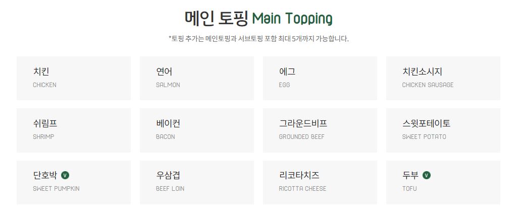 샐러디 장점은 토핑 추가가 가능한 것입니다. 메인 토핑과 서브 토핑으로 나누어져 있으며 메인 토핑으로는 치킨, 연어, 에그, 치킨 소시지, 쉬림프, 베이컨, 그라운드 비프, 스위트 포테이토, 단호박, 우삼겹, 리코타 치즈, 두부가 있습니다.
