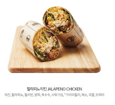 할라피뇨 치킨은 치킨, 할라피뇨, 칠리 빈, 양파, 옥수수, 사워크림이 들어가 있으며 추천 소스는 크리미 칠리입니다. 혹시 너무 맵다면 드레싱을 허니머스터드나 오리엔탈로 변경하는 것도 추천합니다.