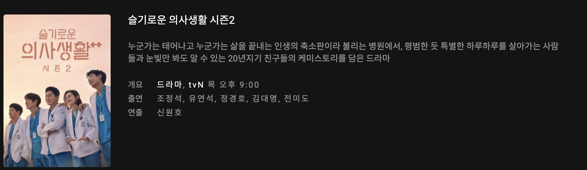 요즘 볼만한 드라마는 슬기로운 의사생활 시즌 2 한 가지밖에 없는 것 같습니다. 매주 본방사수하려고 노력하지만, 오후 9시 드라마 보는 시간을 항상 놓치게 됩니다.