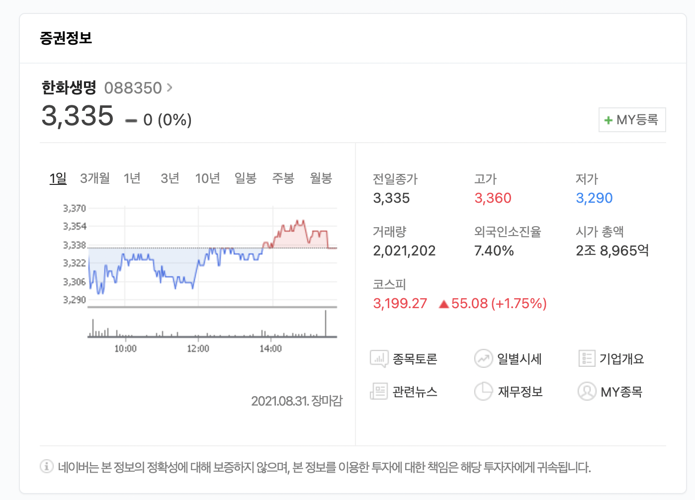 한화생명은 한화그룹 계열 생명보험사로 한화자산운용, 한화63시티, 한화손해사정, 한화라이프랩, 한화손해보험 등 다양한 계열의 기업을 보유하고 있습니다. 2021년 8월 31일 현재 일봉, 주봉 차트를 보면 잠시 하락했다가 상승하는 모습을 보여주고 있습니다. 시가총액은 2조 8,965억 원으로 동종업계 대비 시가총액은 높은 편입니다.