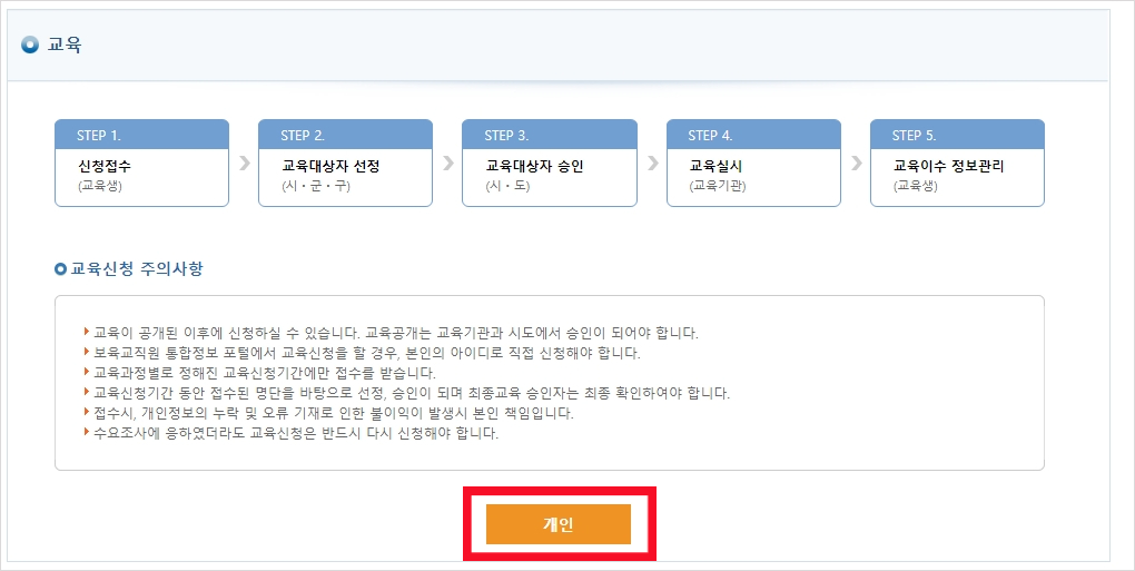 4. 교육신청 주의사항을 꼼꼼히 확인하고 '개인'을 클릭합니다.