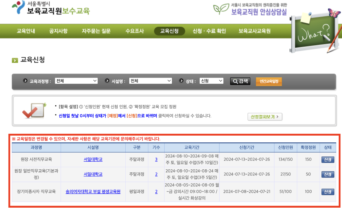 4. 교육기간, 신청기간, 과정명을 확인한 후 '신청'을 선택합니다.