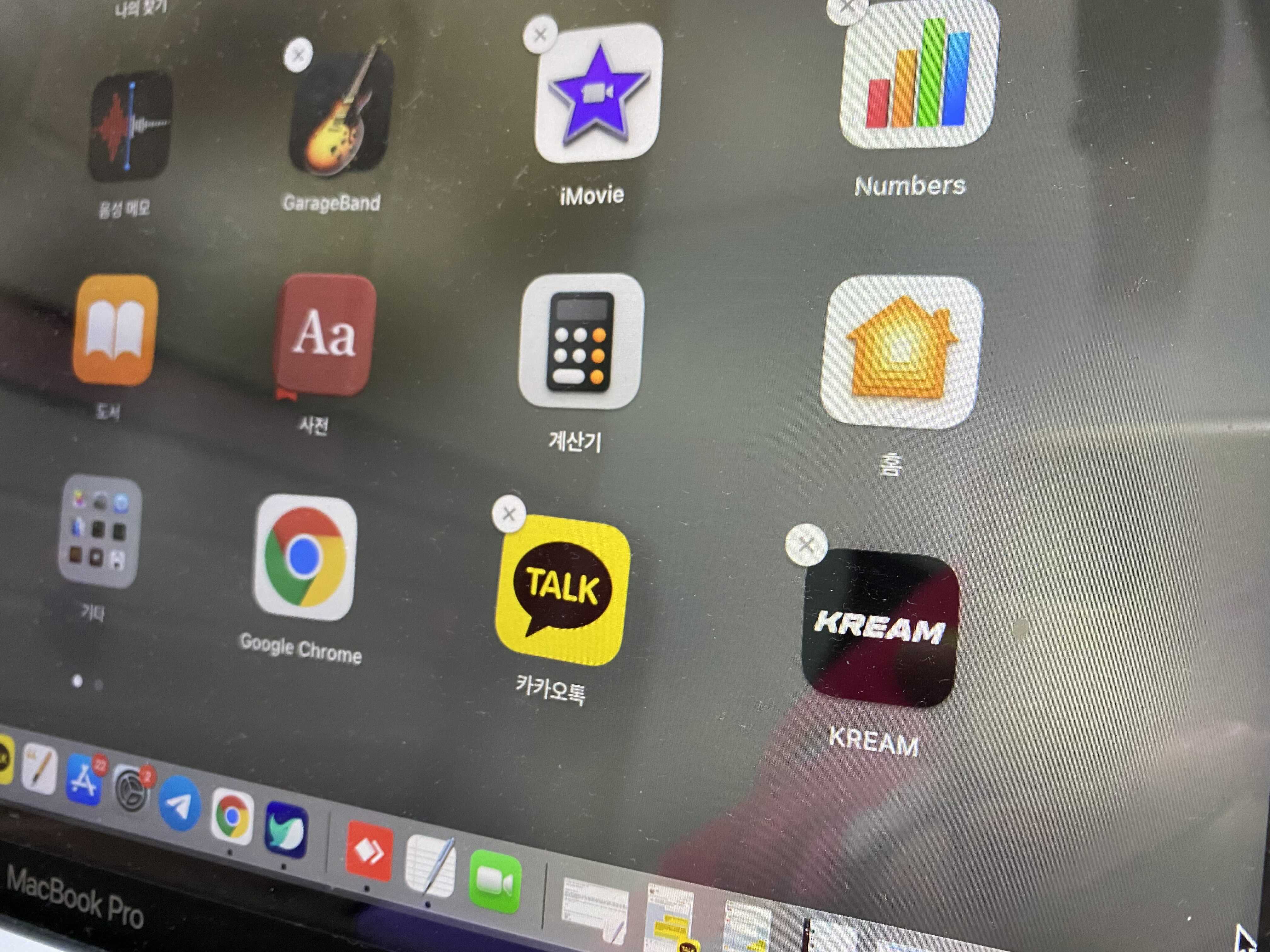 이 상태에서 마우스로 아이콘을 꾹 누르고 있으면 아이폰에서 어플을 편집(삭제)할 때처럼 편집 모드가 활성화되면서 아이콘이 흔들흔들 움직이는 모습을 보여줍니다. 맥북은 아이폰과 연동되므로 아이폰에서 설치한 프로그램이 맥북에도 모두 나타납니다.