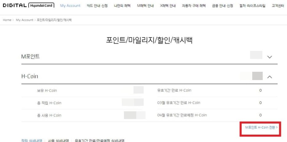 먼저 현대카드에 쌓여있는 M포인트를 H-Coin으로 전환해야 현금화가 가능합니다. 따라서 총 2번의 절차가 있으므로 다소 복잡하게 느껴질 수도 있습니다.